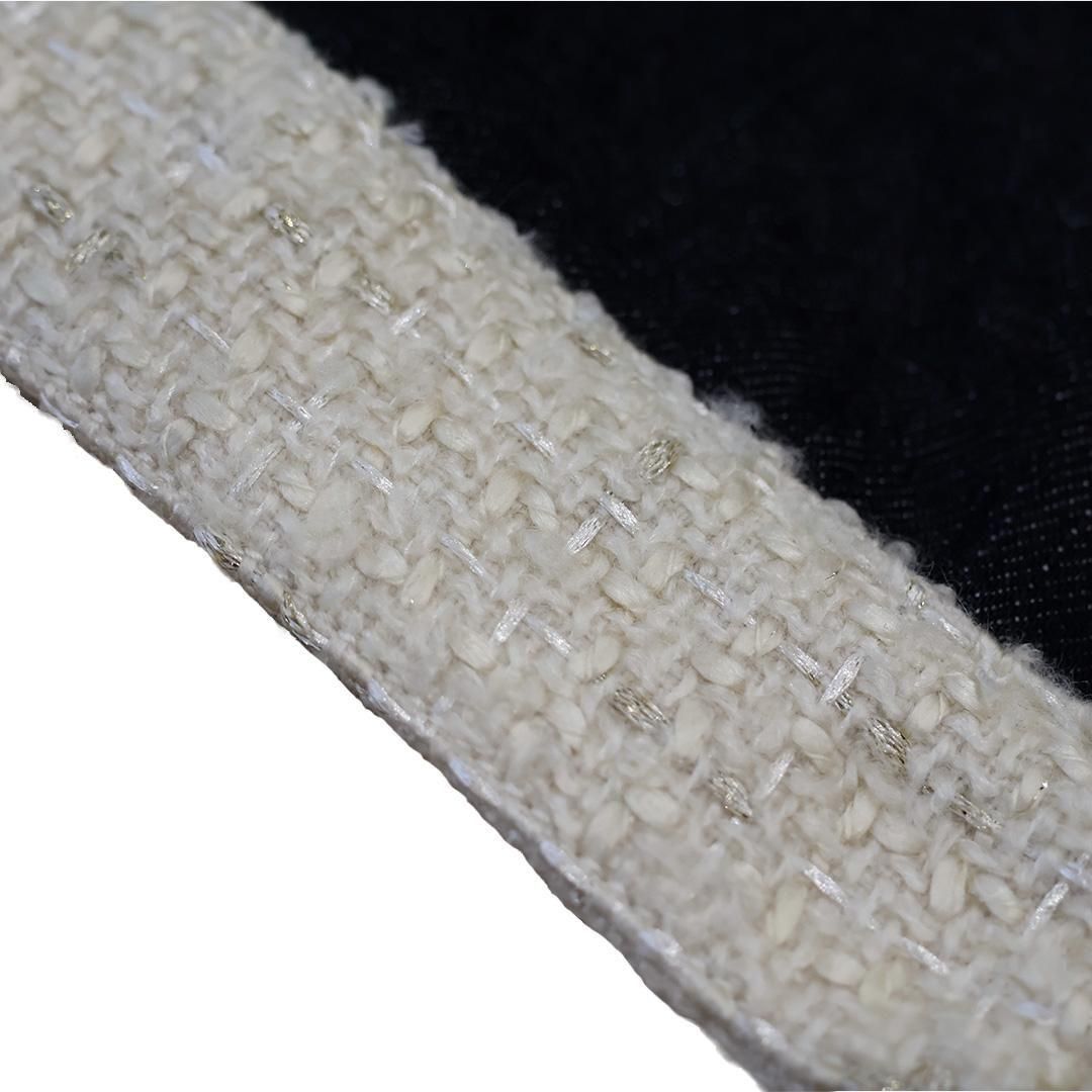 縫製前にデニム生地を洗い柔軟加工を施した上で裁断、ツイードとのドッキング縫製で製作。